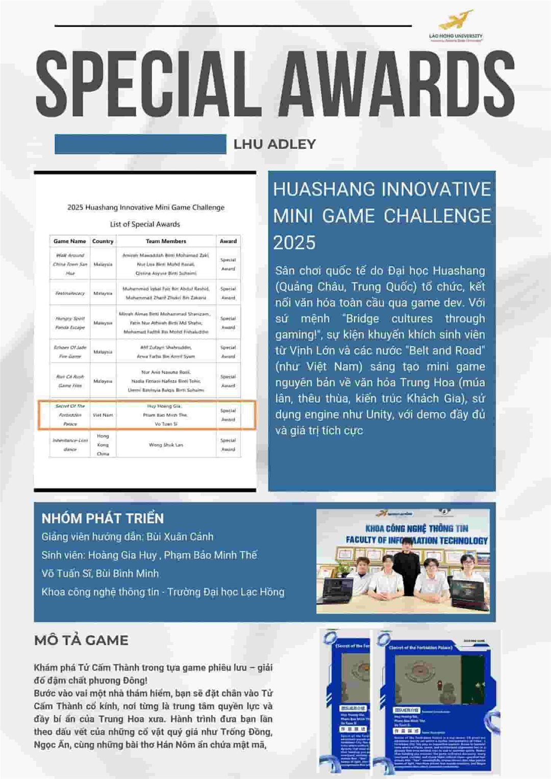 The LHU Adley team including Hoang Gia Huy, Pham Bao Minh The, Bui Binh Minh, Vo Tuan Si, under the guidance of their mentor, Bui Xuan Canh from the Faculty of Information Technology, made history at the Huashang Innovative Mini Game Challenge 2025 by winning the Special Award. Earlier, LHU Adley was the only Vietnamese team to reach the Top 5.